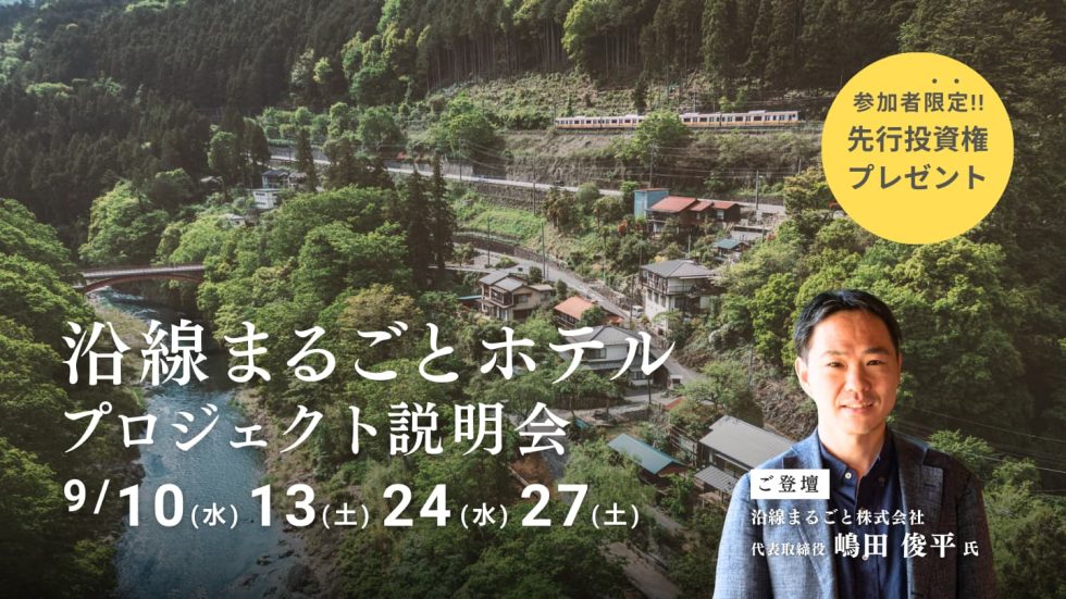 これまで、ファンドの正式募集開始(9月頃予定)に先立ち、オンラインにて「沿線まるごとホテル構想」の全貌や出資対象となるプロジェクト、さらに計画中のファンド情報まで“まるごと”お届けしてまいりましたが、9月はオンラインのみならずリアルでの開催が決定いたしました!(※リアル開催は招待制です) 本イベントでは、沿線まるごと株式会社 代表取締役であり、さとゆめ代表でもある嶋田俊平さんがご登壇!直接、この事業の概要やこれまでの取り組みについてお話を伺える貴重な機会です。