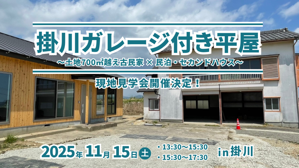 静岡県掛川市にある、ガレージ付きの平屋古民家を現地でご覧いただける見学会を開催します。