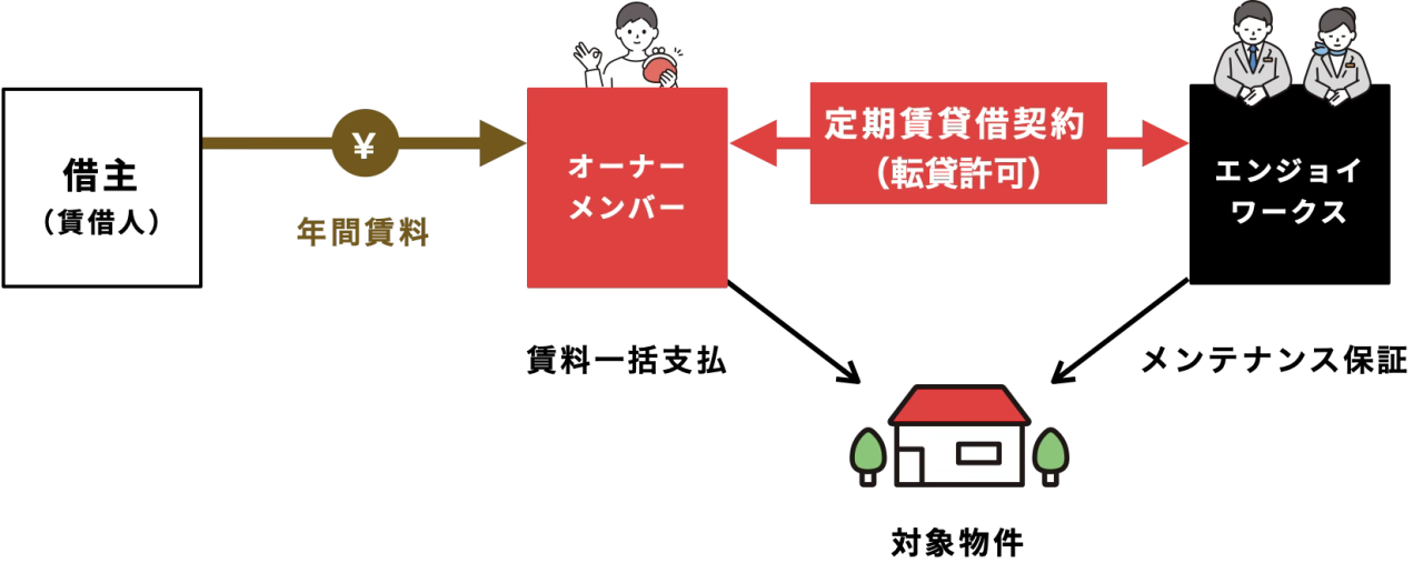 毎月の賃料収入を受け取ることで、長期的かつ安定したキャッシュフローを期待できる点が大きな魅力です。運営管理業務はエンジョイワークスおよび関連会社が担うため、オーナーメンバーの皆さまは手間をかけずに、運用成果を享受していただけます。