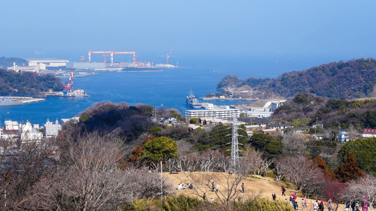 登り始めて数分、たどり着いた先には梅の木がずらりと並び、頭上には広い空が広がっていました。さらに上へ進むと、田浦のまちから横須賀、そして東京湾までを一望できる芝生の高台へ。先ほど訪れた月見台住宅や港に浮かぶ軍艦、横須賀の街並みを一度に見渡すことができます。さらに、左手には横浜・八景島シーパラダイスを望み、空気が澄んだ日には、きっとみなとみらいの景色まで見渡せるはず。視界いっぱいに広がる景色は、思わず深呼吸したくなるほどの、なんとも贅沢な眺めでした。